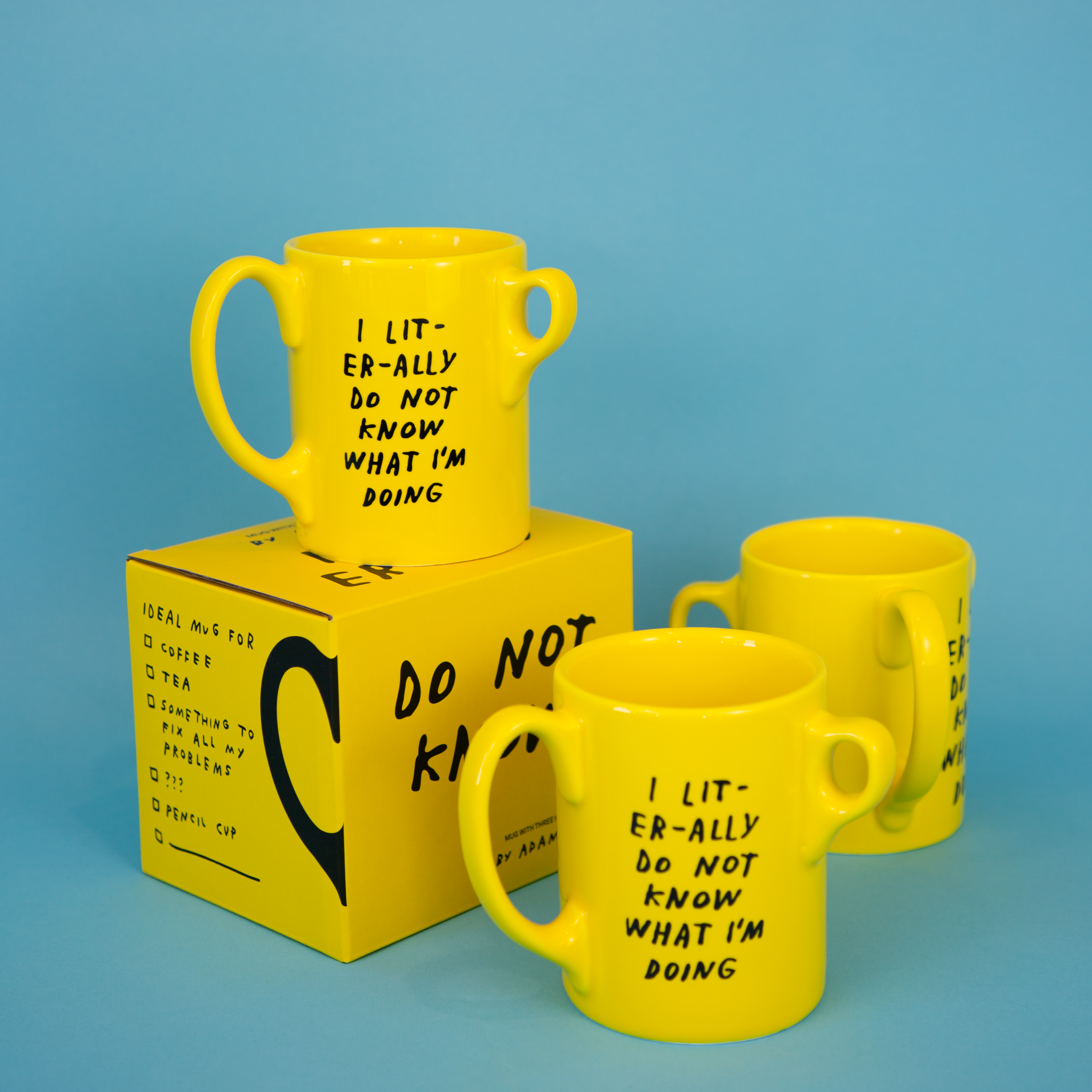 A unique three-handle ceramic mug by Adam JK spells it out as directly as possible: We're figuring it out, and it's literally fine.